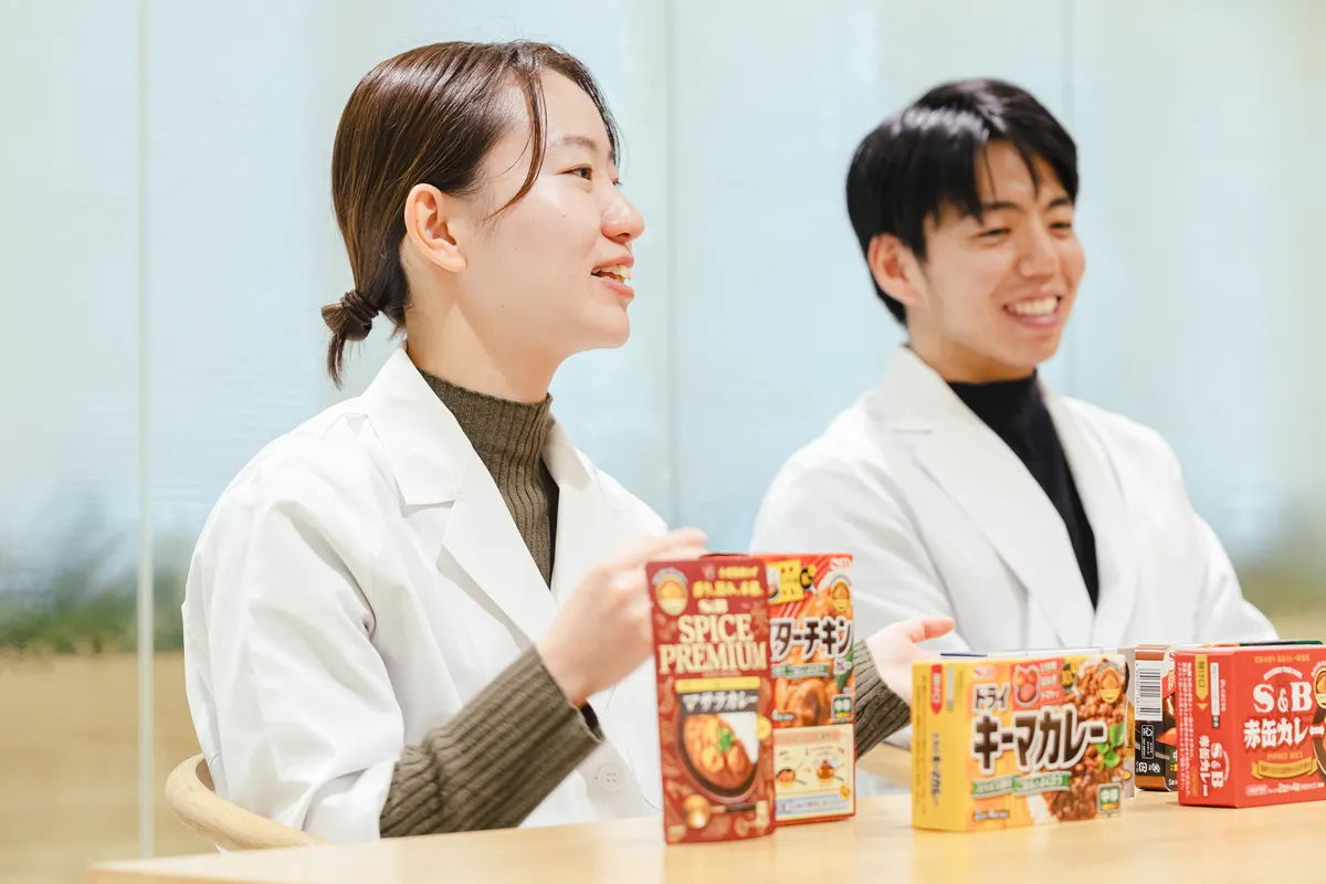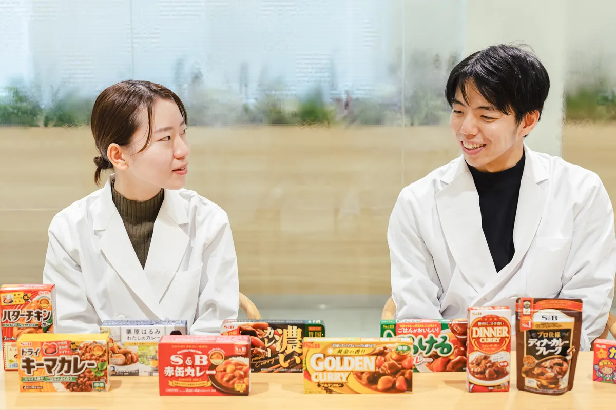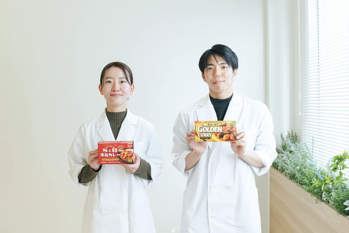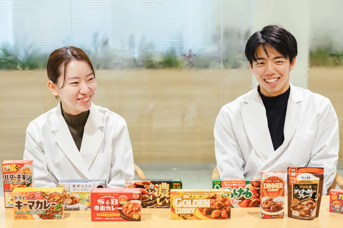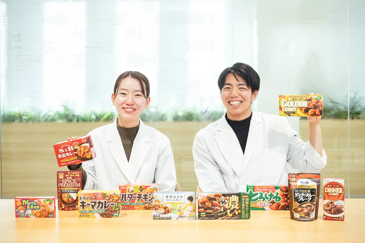 1月22日の「カレーの日」にちなんで、今回はカレーの魅力を深掘りします! エスビー食品では、「赤缶カレー粉」をはじめ、香辛料やレトルトカレーなどさまざまな商品を展開していますが、主力のひとつとなるのはカレールウです。今回は味づくりや資材の選定など、カレールウの商品設計を担う開発担当のメンバーにインタビューを実施。第2商品開発ユニット 即席チームに所属する佐藤光希子さんと北村航太さんに、日々のお仕事や味づくりのこだわりなどについて幅広く語っていただきました。
