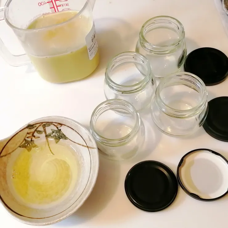 普段作るオリジナルのプリン液に、朝のからだ青汁を溶かしこみ、何度か濾して蒸しあげました。