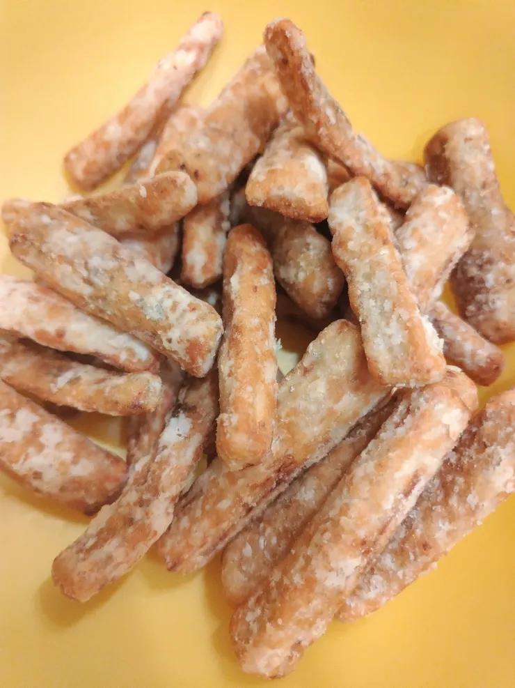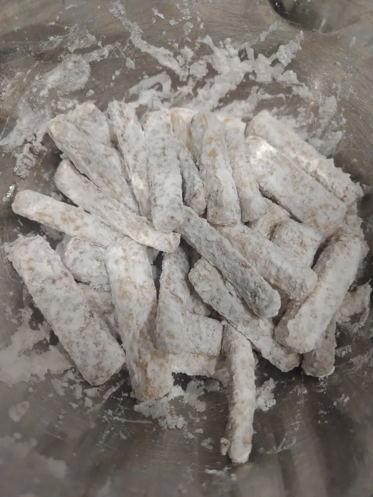 ①ごぼうは洗って土を落とす。食べやすい長さに切った後、太いものは四つ割り、細いものは二つ割りにした後、麺つゆとガーリックパウダーを加えてポリ袋等に入れて30分ぐらい漬け込む。