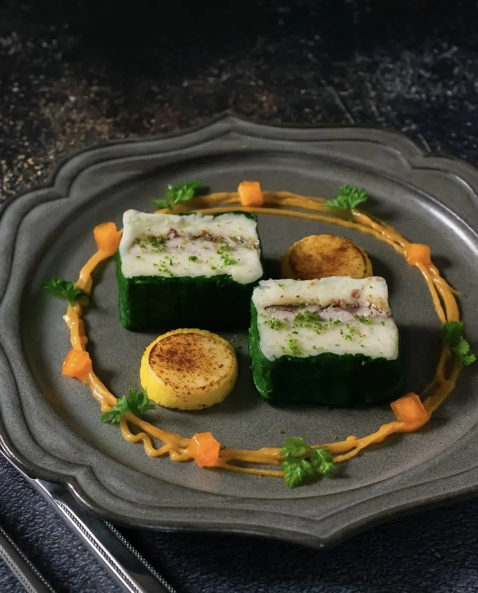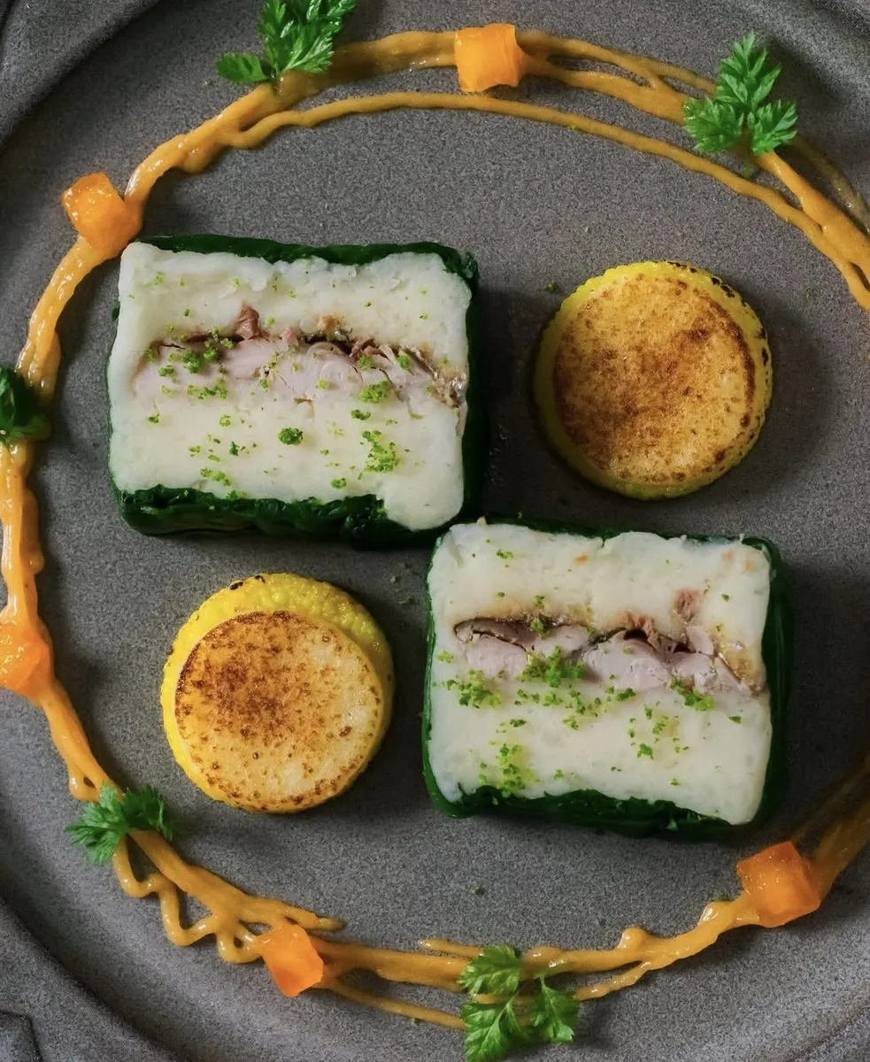 テリーヌの横には丸くくり抜いた長芋をターメリックでソテーし黄色く色づけ、上にこちらも丸くくり抜いたチーズを乗せてバーナーで炙りました。秋らしくお月さまのイメージで作ってみました🌕