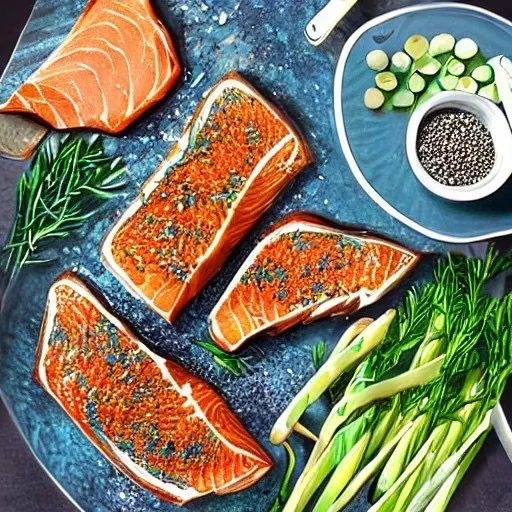 - まず、サーモンの切り身に塩とブラックペッパーを振り、焼く直前まで冷蔵庫で寝かせておきます。
