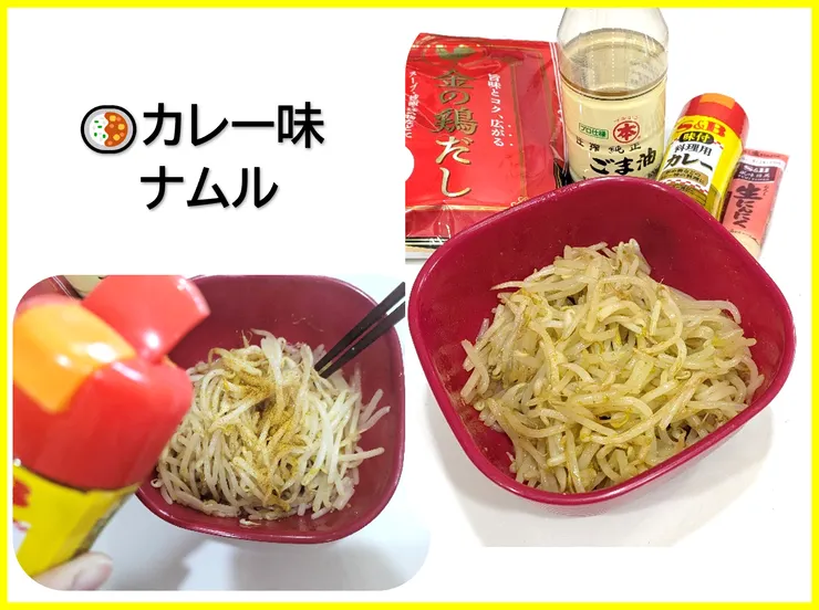 もやしをレンジで2分ほど加熱して、鶏ガラスープの素・ごま油・カレパウダーをかけるだけ