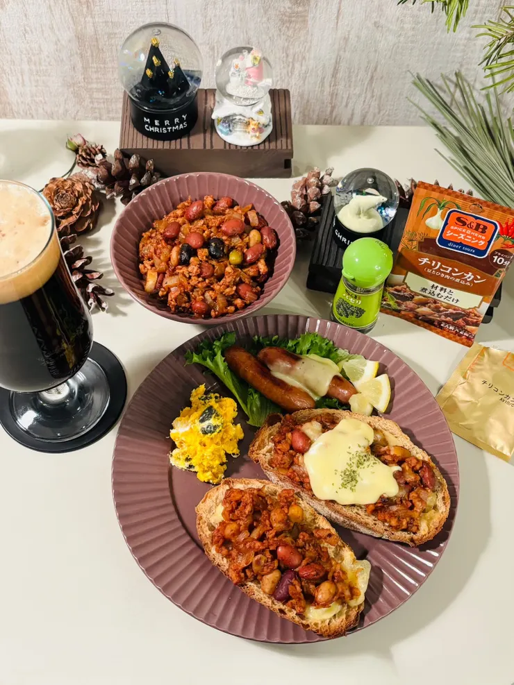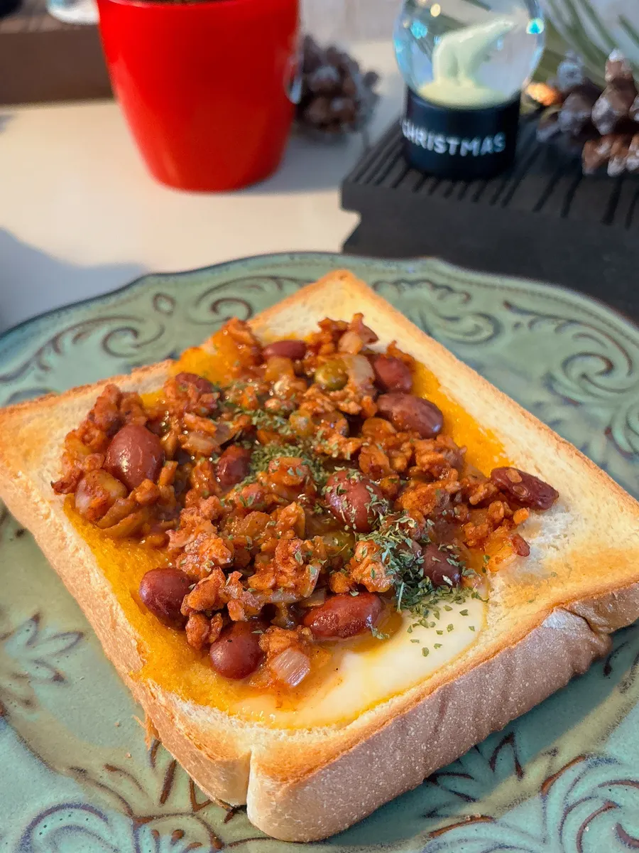カンパーニュにチーズを掛けて軽く焼き、つくったチリコンカンを乗せてさらに焼いてみました。