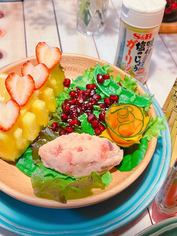 サイドメニューには、いつもの「エスビー味付塩こしょう」を使い、マヨネーズとヨーグルトでヘルシーに、ビーツ入りのポテトサラダを添えて。 フルーツサラダと一緒に並べたら、食卓が一気に南国気分になりました🏝️