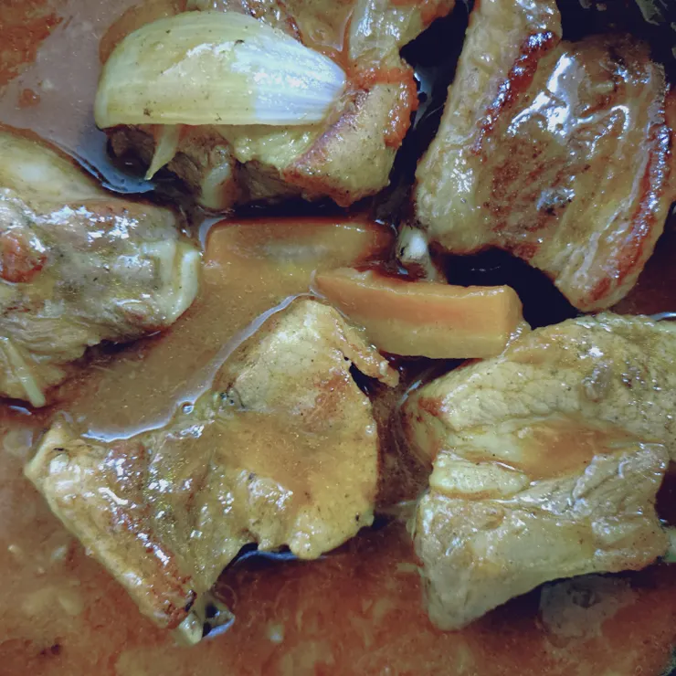 最初にスパイスと白ワインビネガーで漬け込んだ骨付き豚バラ肉をじっくり炒めてから