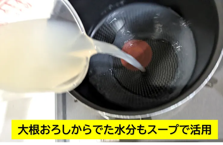 →タレは醤油・みりん・砂糖・しょうがを入れてまぜ、最後に回しかけてゆきます。