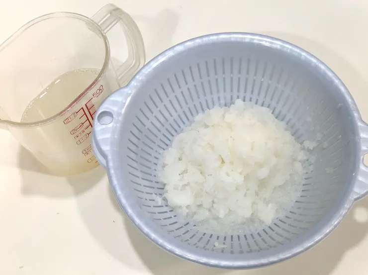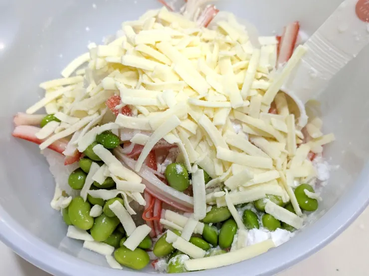大根をすりおろして水切りし→片栗粉・とろけるチーズ・カニカマ・枝豆を入れてまぜます。
