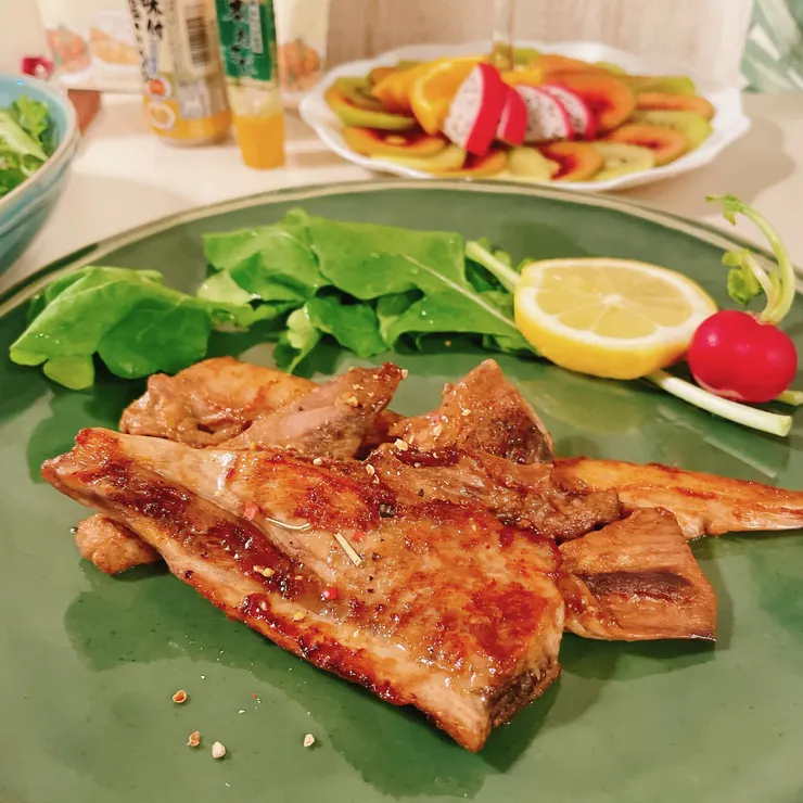 《マグロの照り焼き》下味には「味つき塩こしょう」を満遍なく振りかけて。