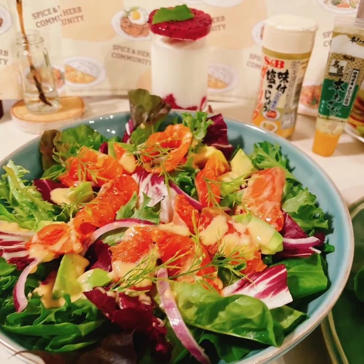 を混ぜて色付けた《サーモンとアボカドのサラダ》