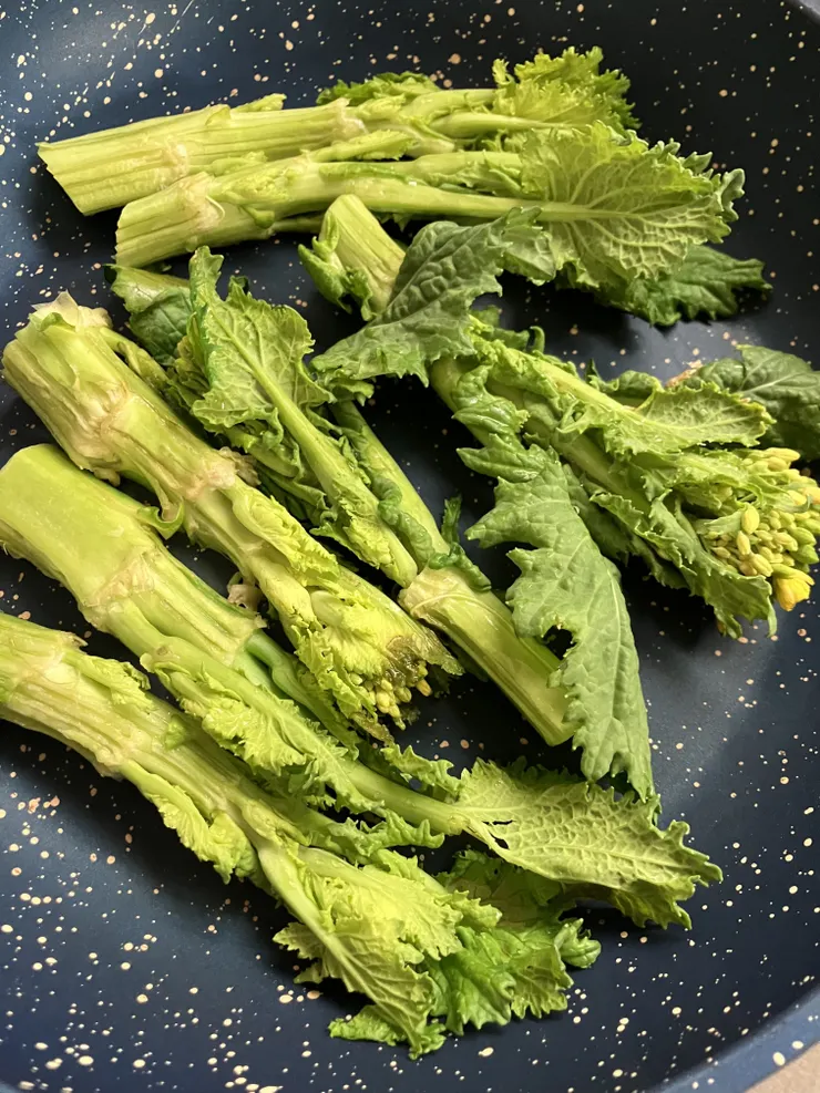 菜の花、見かけて嬉しくなって買ったはいいけど、思ったよりも大きい。。からしあえには向いてない、、、