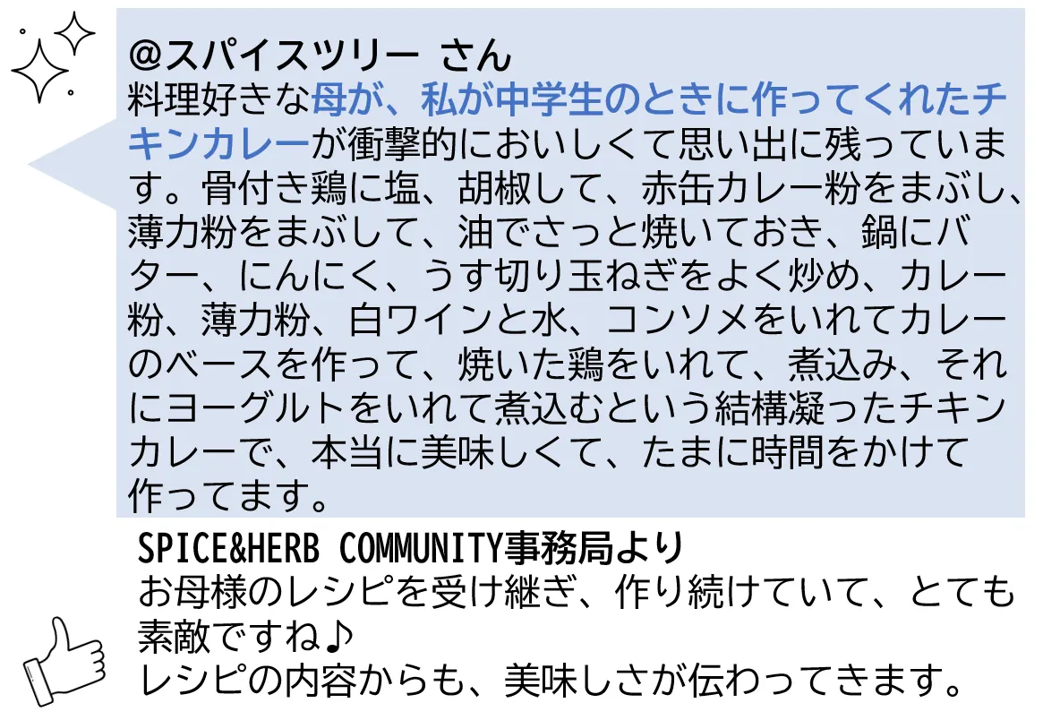 こちらの他にも、素敵な「カレーの思い出」エピソードが集まり、胸が熱くなりました。