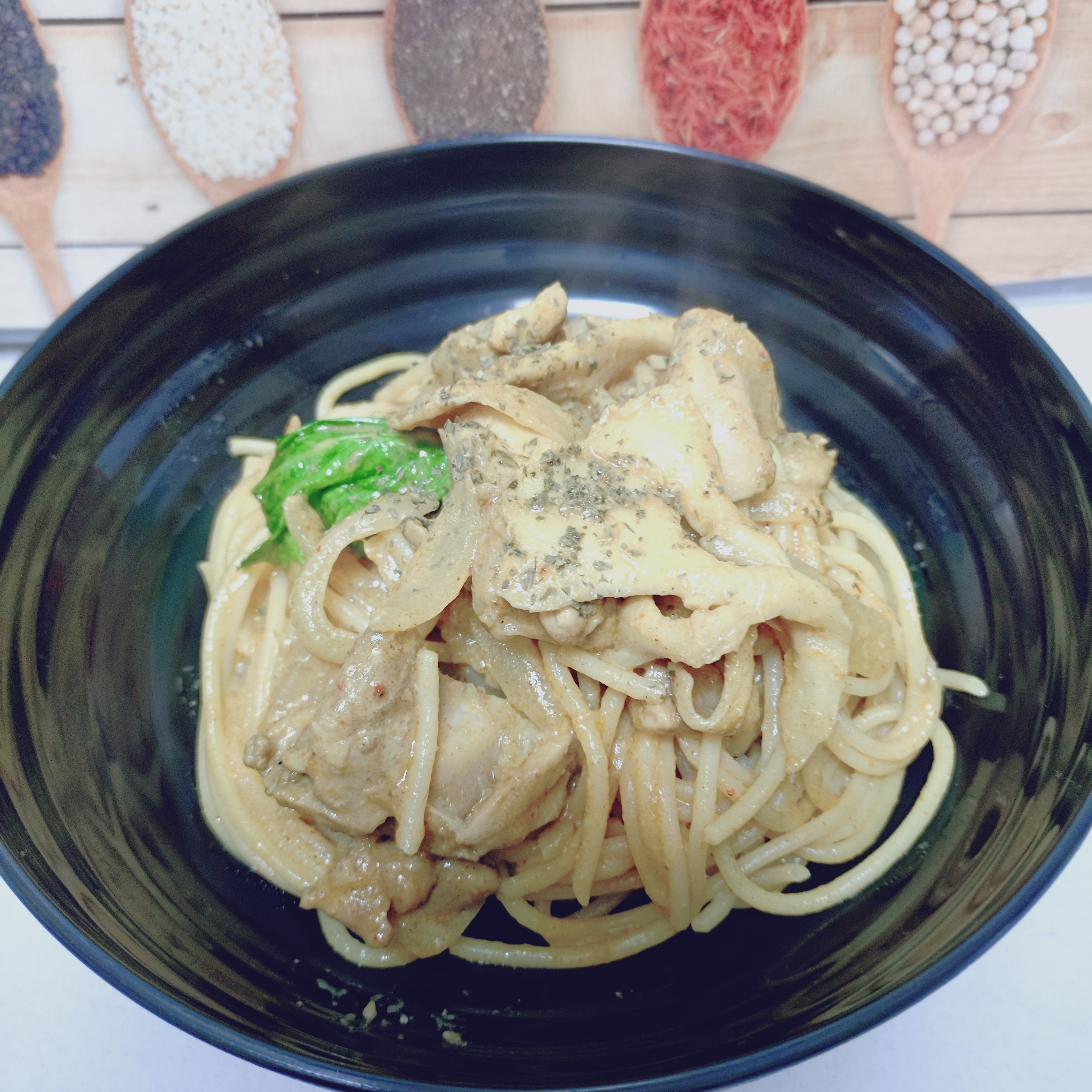 💠新玉ねぎ、舞茸、鶏もも肉のカレー(豆乳)クリームスパゲッティ
