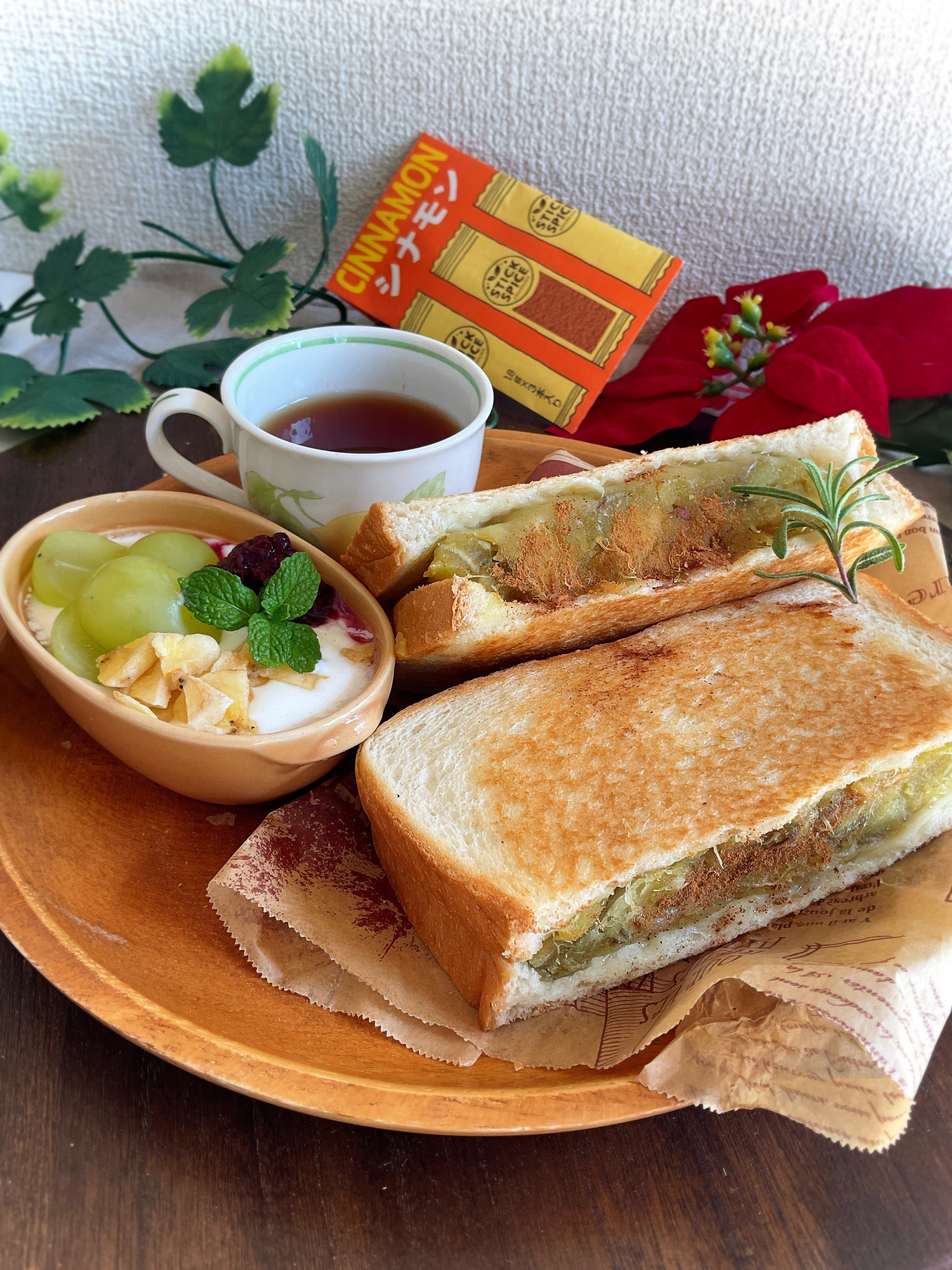 投稿を表示焼き芋のホットサンド、バター、チーズで甘塩っぱい味付けがやみつきになりますね〜