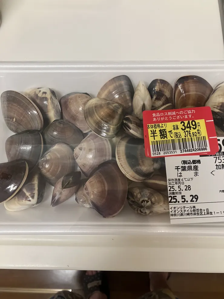 パート遅番の帰りにスーパーに寄ったら、千葉県産のはまぐりが半額に〜🉐