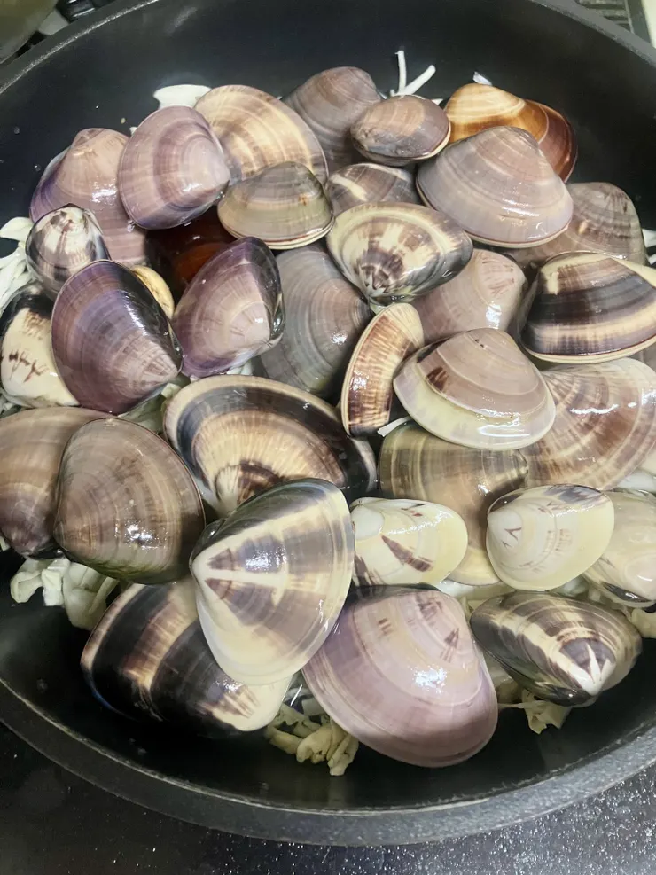 翌日砂抜きしてから、フライパンに細切りにしたキャベツを敷きつめ、白ワインとスティックスパイスのブラックペッパー・ガーリックで蒸して仕上げにスティックスパイスのパセリを振りかけて、美味しくいただきました😋