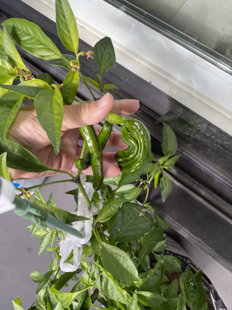 薬物投与しようとしたらすでにぶっとい子がひとり。「辛くならない甘長唐辛子」の方だ。かわいい!ドーピングなしでも大きくなるなんて。