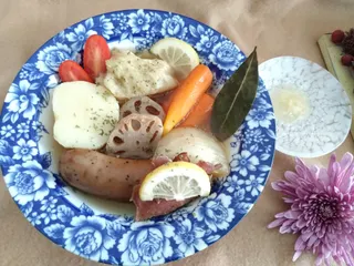 レモン香るさわやかポトフ s&bサイトで見つけた レモン香る爽やかポトフを作りました ベーコンの代わりにソーセージとハムで代用 キャベツ、人参、れんこん、じゃがいも、たまねぎ、家庭菜園ローレル、コンソメとマジックソルトで煮込みミニトマト、生レモン、チューブ調味料きざみレモンを入れ軽く火を通しパセ