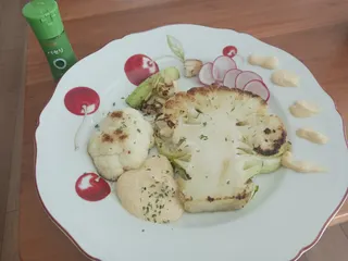 カリフラワーステーキ 主婦には、なによりのぜいたく!カリフラワーステーキ! ナイフとホークで、たべてみた。ホクホクして、焼きニンニクたべたみたいだ!みんなも、カリフラワーステーキしてみて!! 2周年コンテスト