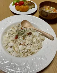 ドライトマトのピラフ ミニトマトをたくさんもらったのでドライトマトを作りました。オリーブオイルに漬けたものをご飯と一緒に炒めてピラフ?洋風チャーハン?に。ブラックペッパーやパセリをかけて食べました🍅