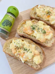 オープンサンド からし、マヨネーズ、ゆで卵を和え、塩胡椒で味を整え、バケットの上にのせました。パセリをちらしてオープンサンドの完成!からしを加えるのがポイントです。からしはもちろん!エスビーのねりからし✨