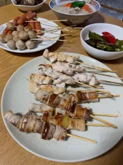 焼き鳥の夕ご飯 夕ご飯は焼き鳥でした。いつものウインナーとか鶏団子も、串に刺すとワクワクしちゃうのかよく食べる子供達。足りないくらいでした😅次からはもっと沢山作ります✨