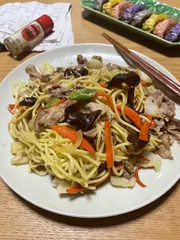 塩焼きそばの夕ご飯 胡椒を効かせた塩焼きそばで夕ご飯でした。大人になってから好物になったきくらげ✨大きめに切って食感を楽しみました😊