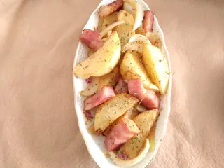スパイシーカレージャーマンポテト クミンシード赤缶カレーを使用してジャーマンポテトを作りました くし型にカットしたジャガイモはレンチンし フライパンにオリーブオイルクミンシード、赤缶カレーを炒めジャガイモ、ベーコンたまねぎをいためコンソメで味付けして完成盛り付けてパセリをパラリとかけましたクミンシードをいためると
