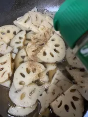 コウノトリおもてなしれんこん コウノトリおもてなしれんこんでれんこんのきんぴら風仕上げに山椒をかけました