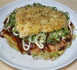 魚ONしたお好み焼 ふわふわに焼いたお好み焼きに白身魚の香草焼きをON。仕上げに自家製七味唐辛子をパラパラ。白身魚の香草焼きは、自家製エルブドプロバンス、ヒハツパウダー、シナモンパウダー、パプリカパウダー、粉チーズ、パン粉を混ぜたものをかけその上にフェネグリークパウダーを少量、テンパリングしたブラウンマスタードシードを