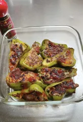 ピーマンの肉詰め スーパーでピーマンが安く売っていたので、ピーマンの肉詰めを作りました。見た目、汚ないですが(笑)いつもは塩、こしょうで、前回は、ナツメグをプラスして作りましたが、今回は、オールスパイスで作ってみました。豚ひき肉の臭みも感じず、オールスパイスの肉詰め、美味しいと思いました。私のお気に入りの一品になりそ