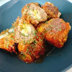 チーズINスパイシーミートボール ミートボールをまん丸く作るのが難しい🥹ひき肉料理にはナツメッグが合いますね♪♪ソースにはチリパウダーを加えてスパイシー感を出しました!