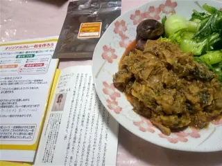 2周年記念スパイス展示館オリジナルカレー イベントで調合したカレー粉でカレーを作りました!作る直前の講習では、香りスパイスは分量どおりに、辛味スパイスはお好みでご随意に、とのご説明でしたので、その時点では冷静に辛味なしの甘口カレー粉にしようと計画していたものの、いざ小さじをチリペッパーの缶に突き立てる段に及んだとたん、なぜか「せっかくだから