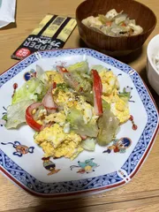 レタス炒め 朝ごはんに、カニカマと卵とレタス炒めを作りました。溶き卵にポン酢醤油とマヨネーズを混ぜてスクランブルエッグを作って取り出し、レタスとカニカマをさっと炒めて卵を戻し入れて混ぜたら出来上がり✨すぐ火が通るし、子供も大好きな味です。大人はブラックペッパーでワンポイントつけました✨