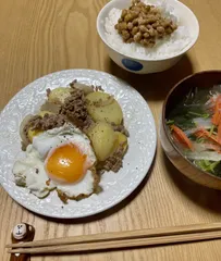 じゃがいも炒めの朝ごはん じゃがいもとひき肉、玉ねぎを炒めました。大人はブラックペッパーを最後にかけています。夫のおじさんからもらったじゃがいもは新鮮でおいしい😋
