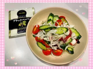 酢の物ちょい足し 旬の野菜、好きな魚介類。 A.砂糖、酢、うすくち醤油、白ワインを耐熱容器に入れて少し温める。(アルコールを飛ばす) きゅうりは塩揉み、新玉ねぎは水にさらす。 野菜の水気を切ってA、オリーブオイルで和える。 ブラックペッパーをミルで挽きながらかける。できあがり。