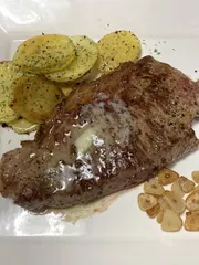 ステーキ メキシコのステーキ用ロース(冷凍) 焼き過ぎると固くなるのでレアですバターを焼き上がりにのせてましたポテトにはパセリふりふり🍀