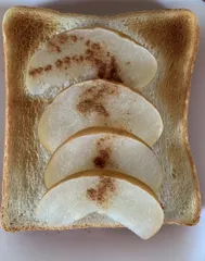 梨のコンポートトースト 材料梨 1個ガムシロップ 1個作り方①梨を5mm幅の薄切りにする。②耐熱容器に①とガムシロップを加えて600W 4分電子レンジにかける。③蓋をしたまま粗熱をとる。④食パンに梨のコンポートをのせて焼く。⑤シナモンを振りかけて完成。