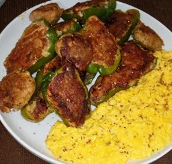 ピーマンの肉詰め スクランブルエッグ添え