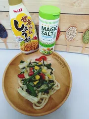 💠余ったうどん1玉で焼きうど〜ん😀 💠1玉余り焼きうどんを作りました〜 キャベツ、しめじ、ニラ、パプリカ、をヘットで炒めて、うどんをレンチンして具材と混ぜ合わせる時に甘辛だれしょうがをたっぷり入れ味をみてマジックソルトをふりふり〜 お肉は入ってないのにヘルシーで美味しかった〜😋かつお節、紅しょうがを添えて〜♪🔸ソー