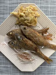 トリフ風味の黒むつ唐揚げ 黒むつ4尾、白海老適量、小麦粉適量、コーンスターチ適量、ネギ適量、唐辛子適量、イタリアンハーブミックス適量、トリフオイル適量、ガーリックパウダー適量、塩胡椒適量黒むつのヒレを全て取り除いてウロコとワタを取る。黒むつ全体にトリフオイルを塗って塩胡椒、ガーリックパウダーをまぶしたらコーンスターチを付けて