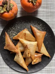 カリとろ柿の春巻きパイ 柿1個、春巻きの皮5枚、五香粉適量、ローズマリー適量柿を細かく賽の目に切る。切った柿をボールに入れ、五香粉を振りかけ混ぜ合わせる。春巻きの皮を中央から切って10枚にする。春巻きの皮の端に乗せて三角に折りたたむ。揚げて油を切って盛り付けたらローズマリーを振る。カリッと揚げて甘い柿と五香粉の香りが美味し