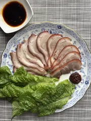 豚もも肉の蒸篭蒸し 豚もも肉皮付きブロック500g、鶏がらスープ400ミリ、老抽適量、生姜スライス3〜4枚、ネギ適量、青山椒粒適量、五香粉大さじ1、クコ適量、蜂蜜大さじ半分〜1鍋に鶏がらスープを入れ老抽、生姜、ネギ、青山椒、五香粉(袋入れ)、クコ、蜂蜜を加えて温めてから火を止め粗熱を取る。豚もも肉を少し多めの油で周りだ