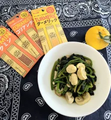 マッシュルームとほうれん草の柚子果汁ソテー🍊 オイルに塩少々 ほうれん草とマッシュルームを炒める少ししんなりしたらたっぷり柚子果汁をかける果汁が飛んできたらクミン+ターメリック+コリアンダーの基本ブレンドと顆粒出汁をお好みで酸味と出汁とスパイスのソテー 旨みをマッシュルームで出そうとしましたがどんこ等と旨みが違うような気がして調べたら