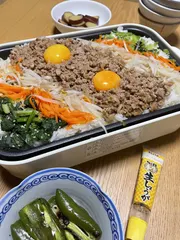 ビビンバの夕ご飯 月曜日に,ホットプレートビビンバを食べました。ごま油でできたおかげが美味しい✨野菜もお肉も取れる完全食なので助かります。