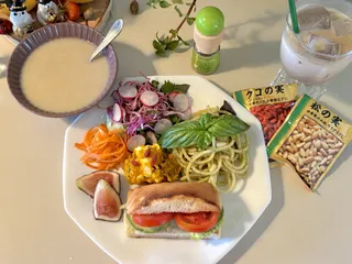 モーニングプレート パンもパスタも食べたいから、、頑張って少しずつ取り揃えました。 ジェノベーゼに添えたバジルは育ててるもの。「松の実」をトッピングかぼちゃサラダには「クコの実」をトッピングキャロットラペには「エルブドプロバンス」を使って5種のサラダには育ちが悪くなった青紫蘇を。柔らかくて小さな葉はいい感じ。