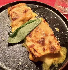 カボチャのとバジルのラザニア いつも作るラザニアですが、今日は生地にかぼちゃを練り込んで焼きました。また、ベシャメルソースの層にはSBさんのバジルを振りかけます。出来上がったら、上に追いバジル!