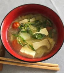 トマトとバジルの絶品、味噌汁! 暑くなって夏バテしそうな時や食欲がない日、バジルを消費したい日はこの味噌汁を作っています。 バジルとトマトの味噌汁 いつものようにダシを取ったらキャベツ、木綿豆腐キノコを入れます。 沸騰したらプチトマトを。 味噌をいれて、火を止めてから刻んだバジル