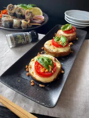 ピザ風☆焼き白茄子 秋になると出てくる白茄子。レシピを参考にアレンジしました。焼いた白茄子、焼いたトマトにチーズとバジルのっけます。さらにナッツ、ブラックペッパーをかけて… 白茄子がとろけるようにやわらかくて、焼いたトマトがソースみたい…それが合わさる事でピザみたいな美味しさ🎵 バジル、見た目も大事