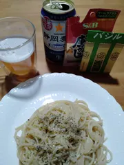 アーリオ・オーリオ・ペペロンチーノ シンプルなのに美味しいアーリオ・オーリオ・ペペロンチーノ🧄今日はペペロンチーノはSBの唐辛子とバジルを使いました。静岡麦酒と一緒に美味しくいただきました。😋
