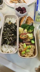 今日のハーブお弁当 今日のお弁当の紹介です。 さばフライ🐟三つ葉かにかま卵焼き🥚いかチンゲン菜のバジル炒め🌿切り干し大根ブロッコリーオリーブオイルハーブソルト和え🌿 ふりかけはハーブティーのでがらしを小松菜 かつおぶしと一緒にしょうゆ みりん 砂糖で炒めて作りました ハーブをま